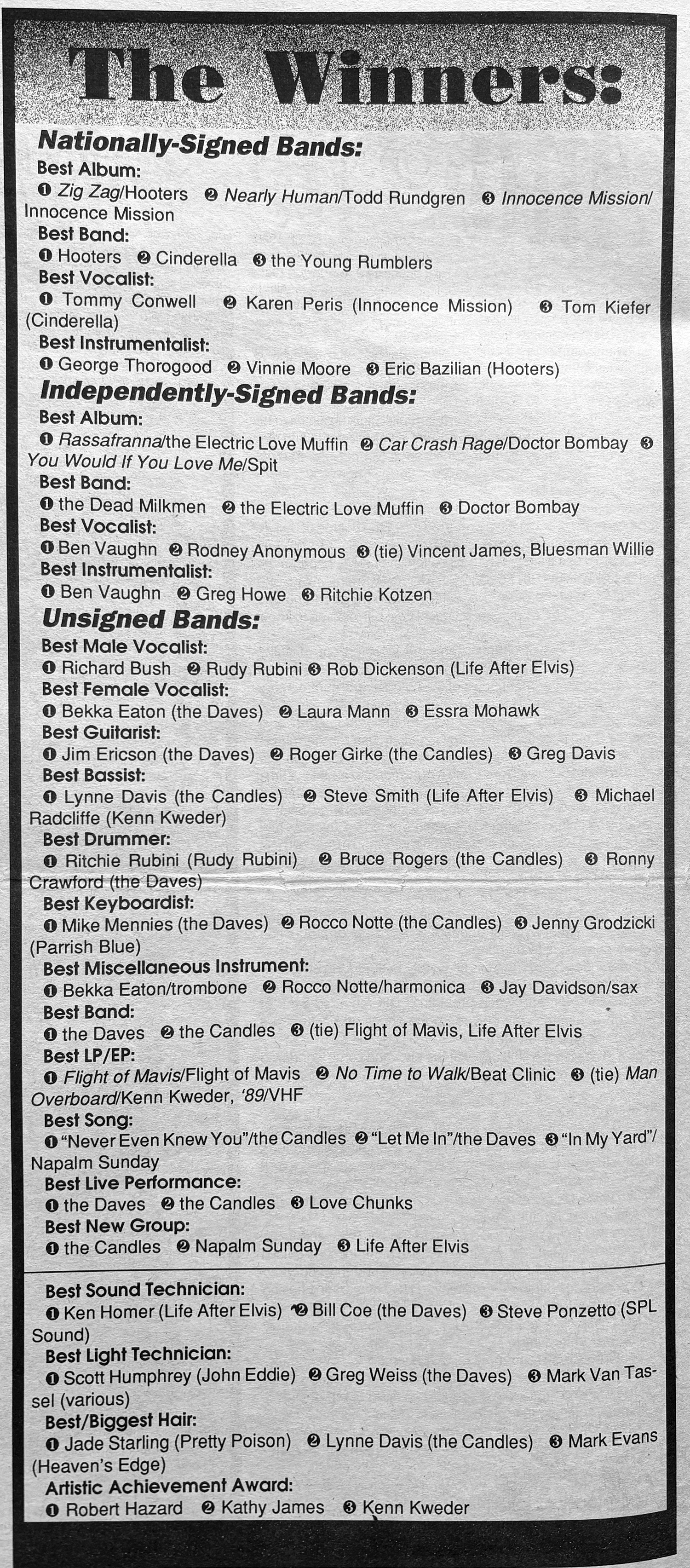 Miscellaneous awards were discussed, and we thought there was a need for a sort of comedy-relief award which would take some of the serious edge off of the poll itself. This is why, at one point, there actually existed a best groupie award, which read something like this on the nomination ballot: “Bands, this is your chance to vote! Cast your ballot for the most enthusiastic fan you have encountered. A first name is sufficient.”